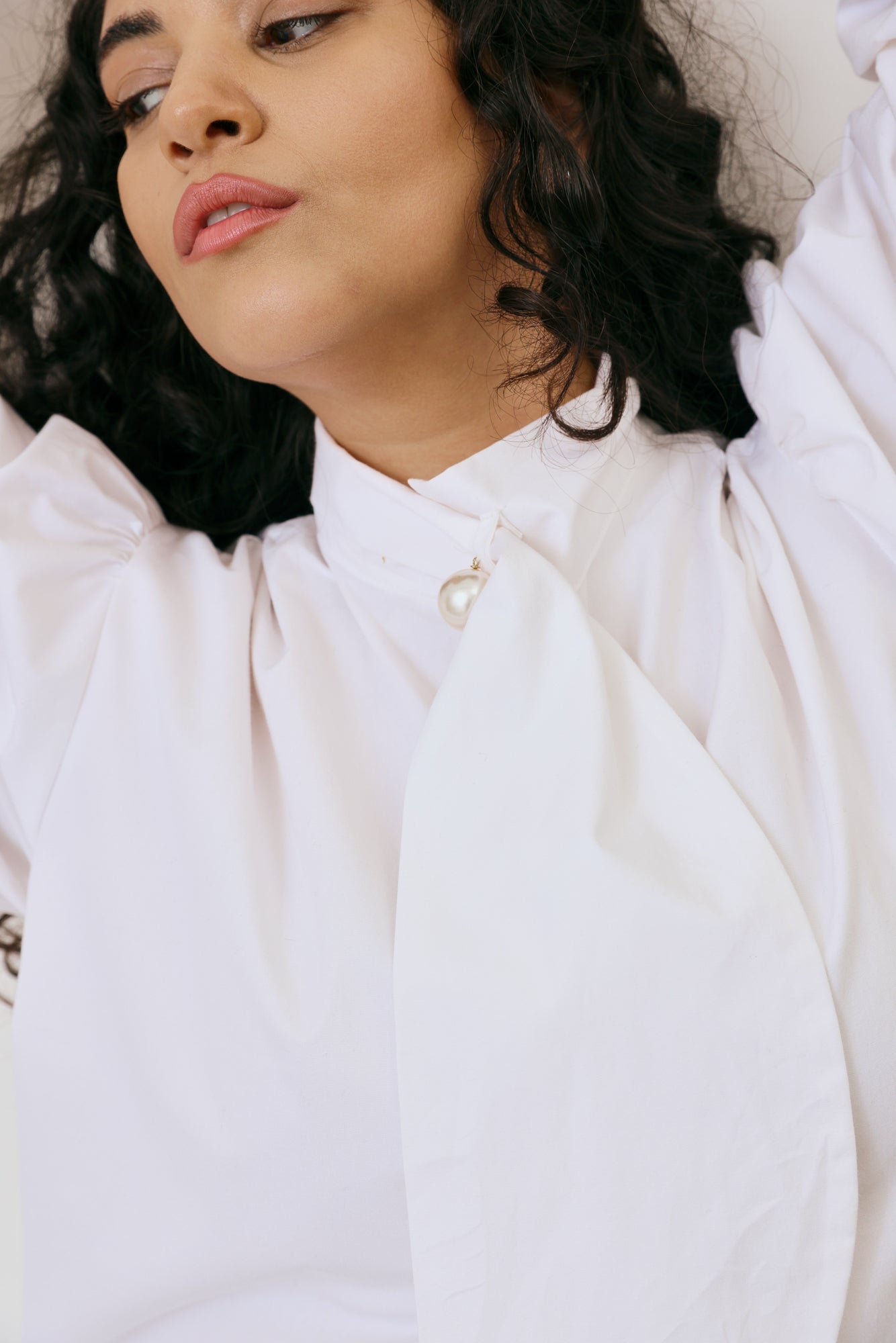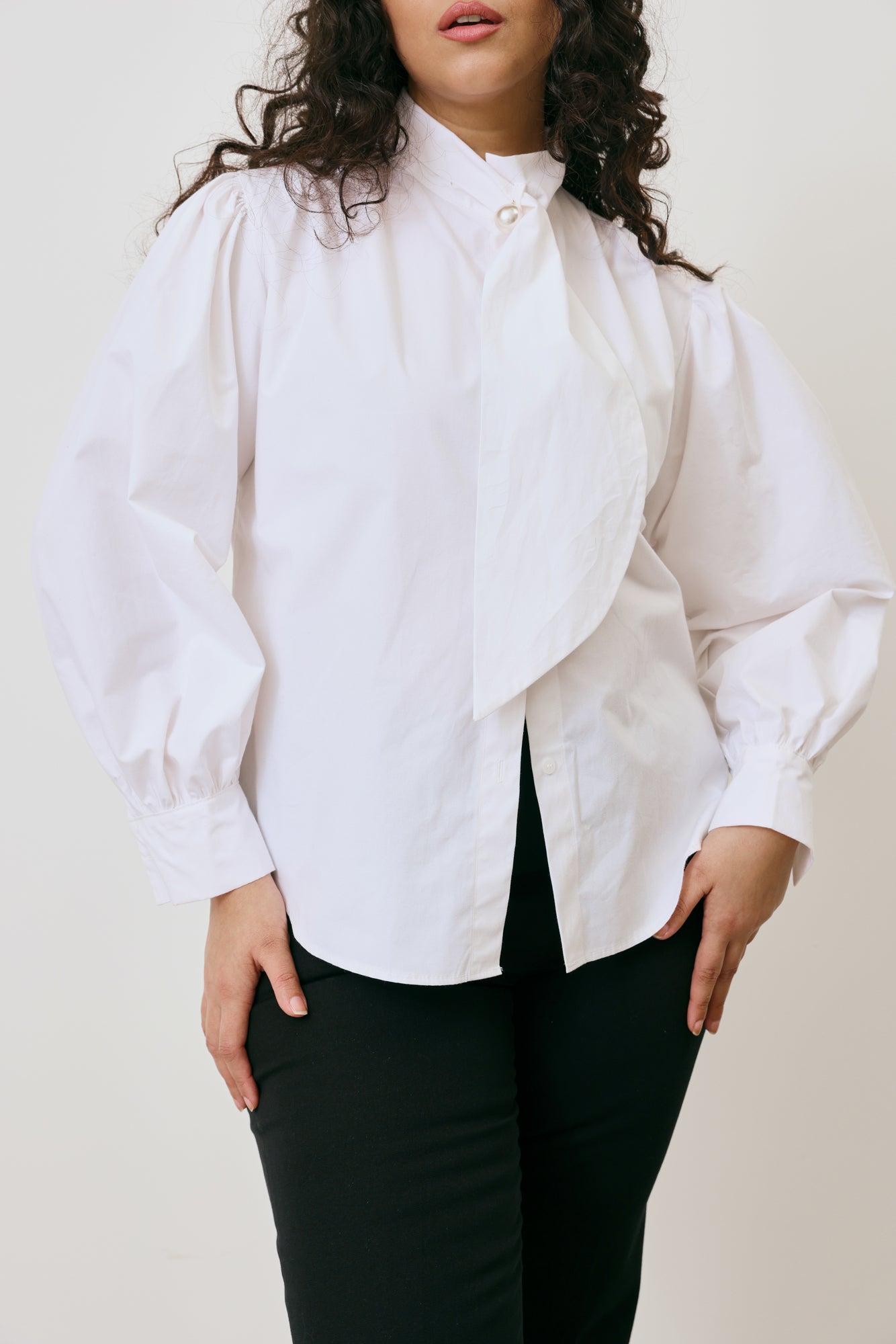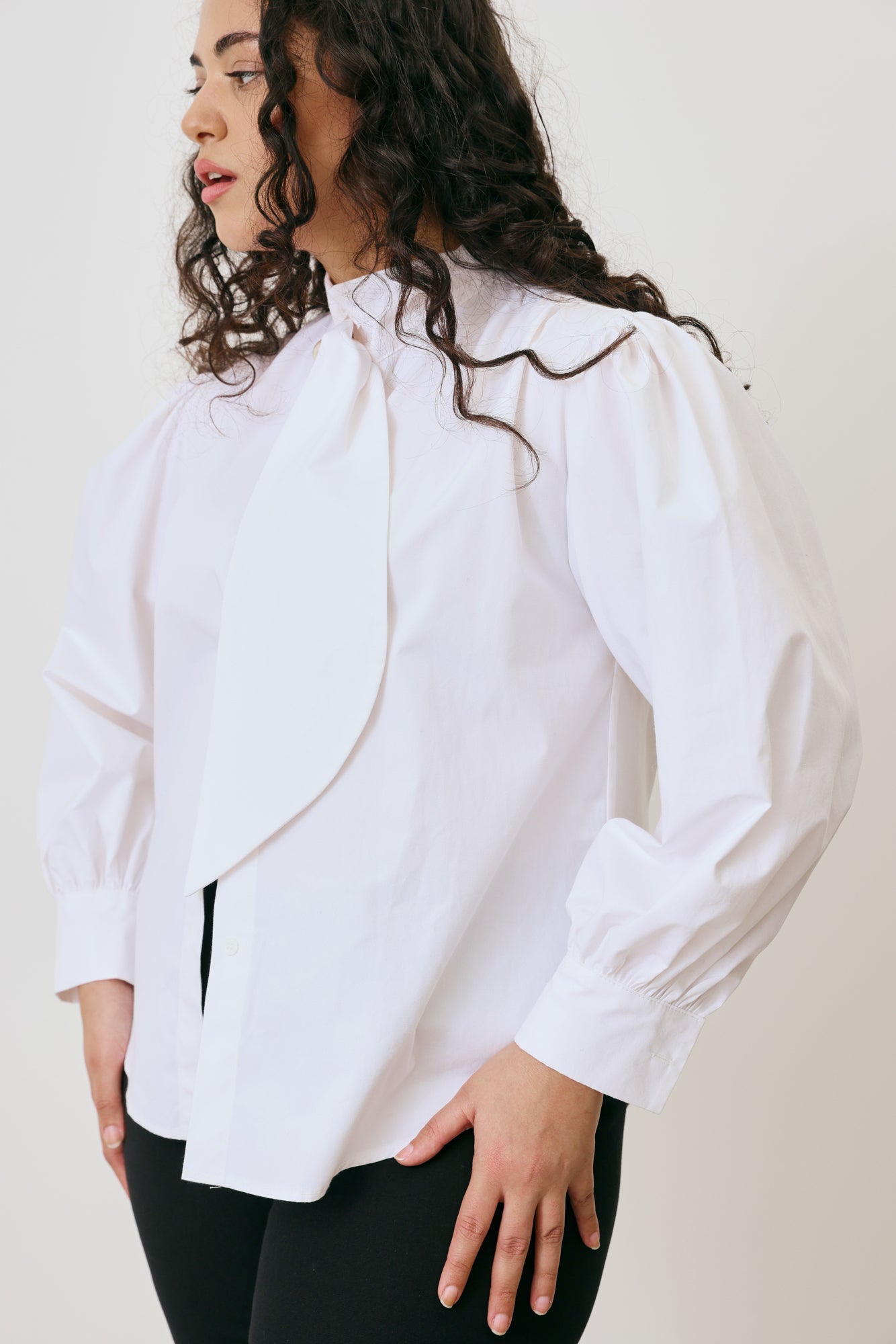Timeless and elegant, this tie-neck blouse blends crisp simplicity with a refined, feminine touch, offering effortless sophistication that moves seamlessly from workwear to evening chic